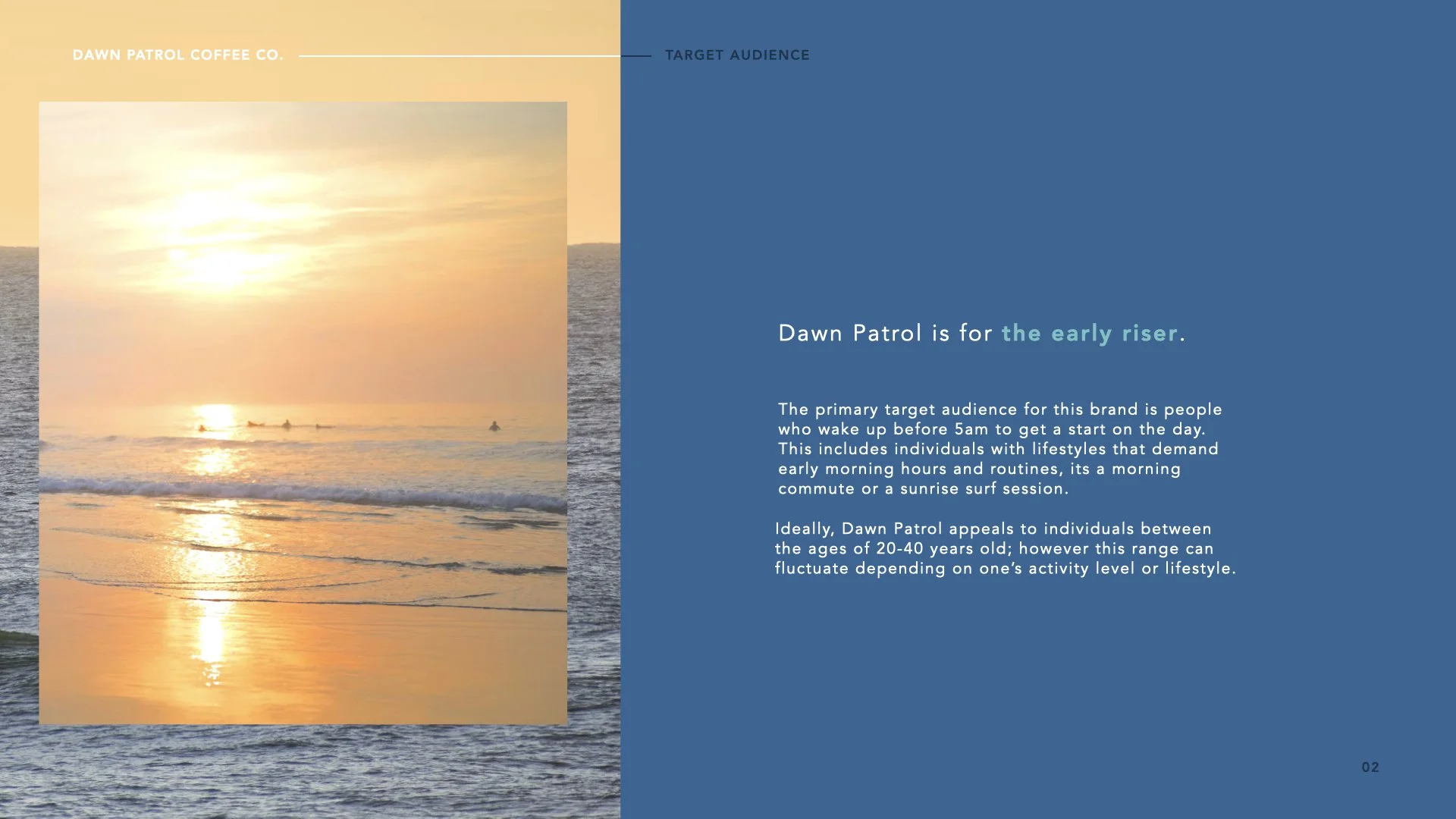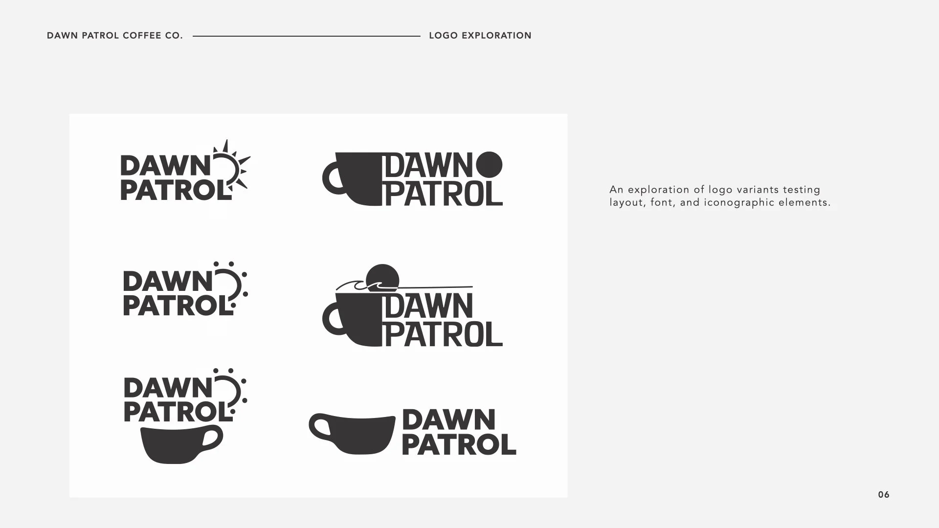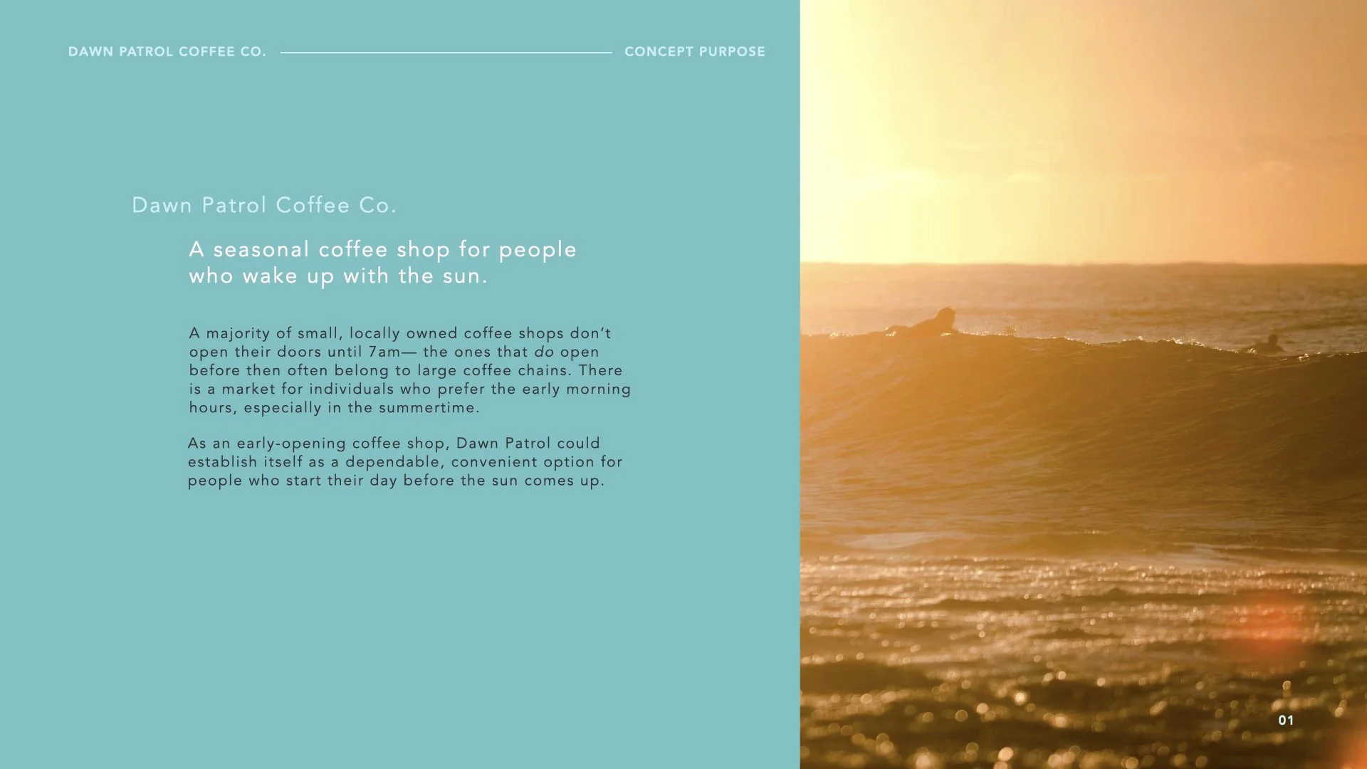 A brand identity concept for an early opening coffee shop by the beach. The purpose of this project was to identify a problem and develop a business concept to provide context for logo design.